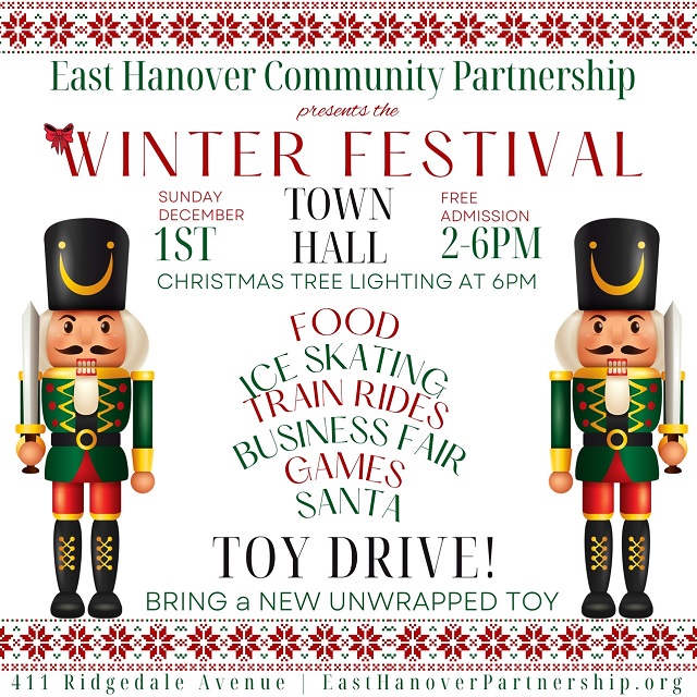 Posted November 22, 2024Kick off the holiday season with a day of family fun at the Winter Festival, hosted by the East Hanover Community Partnership. Join us for festive activities, delicious food, and holiday cheer, ending with the lighting of the townβs Christmas tree!