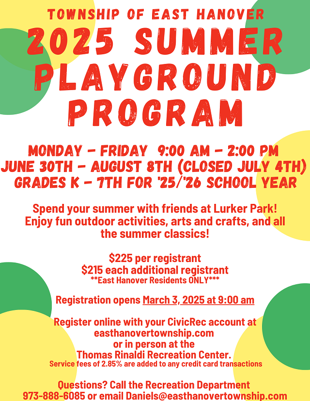 π Questions? Contact the Recreation Department at 973-888-6085 or email Daniels@easthanovertownship.com