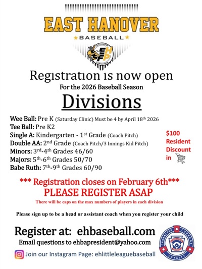 Posted January 09, 2026East Hanover Baseball is excited to announce that registration is now open for the 2026 Baseball Season! Children from Pre-K through 9th Grade are welcome to participate in one of several age-appropriate divisions.