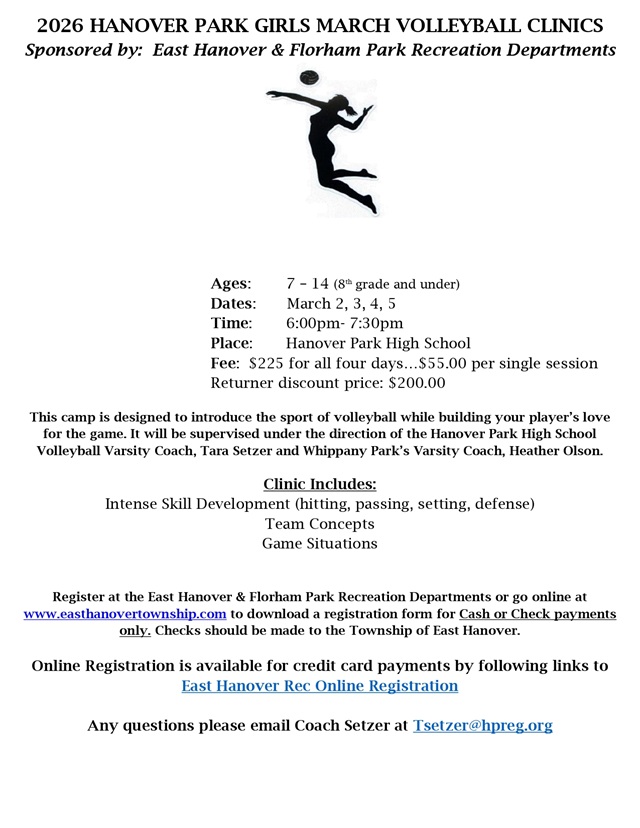 Posted February 09, 2026The Hanover Park Girls Volleyball Clinics are back! This exciting four-day program is designed for girls ages 7 to 14 (8th grade and under) who want to develop their volleyball skills, learn team concepts, and grow their love for the game.