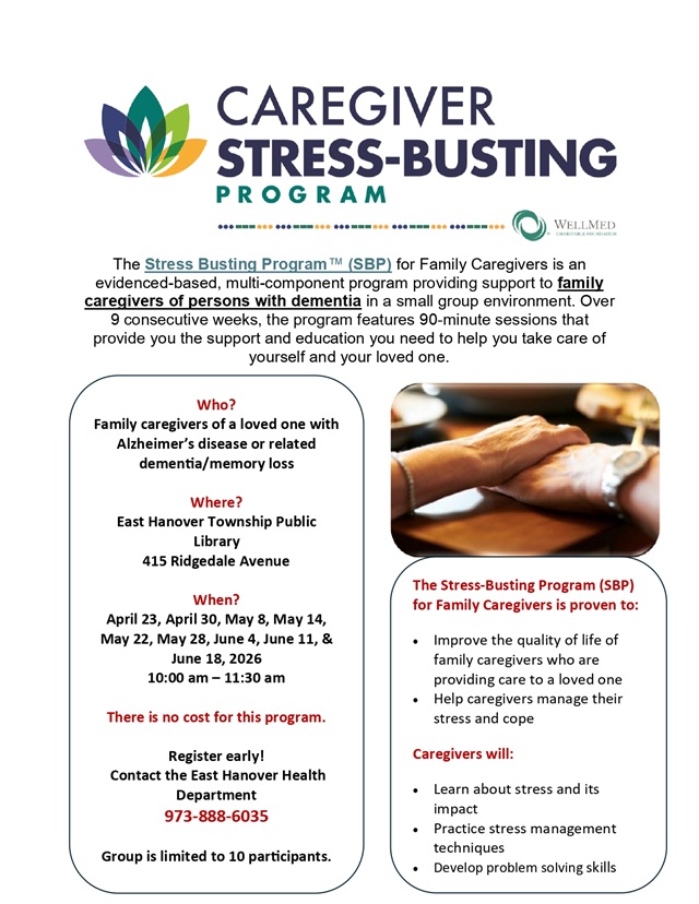 Posted March 10, 2026Family caregivers are invited to take part in the Caregiver Stress-Busting Program (SBP)—an evidence-based, multi-component group program designed to support those caring for a loved one with Alzheimer’s disease or related dementia/memory loss. Over nine consecutive weeks, participants will receive guidance, education, and practical tools to help manage stress while caring for themselves and their loved one.